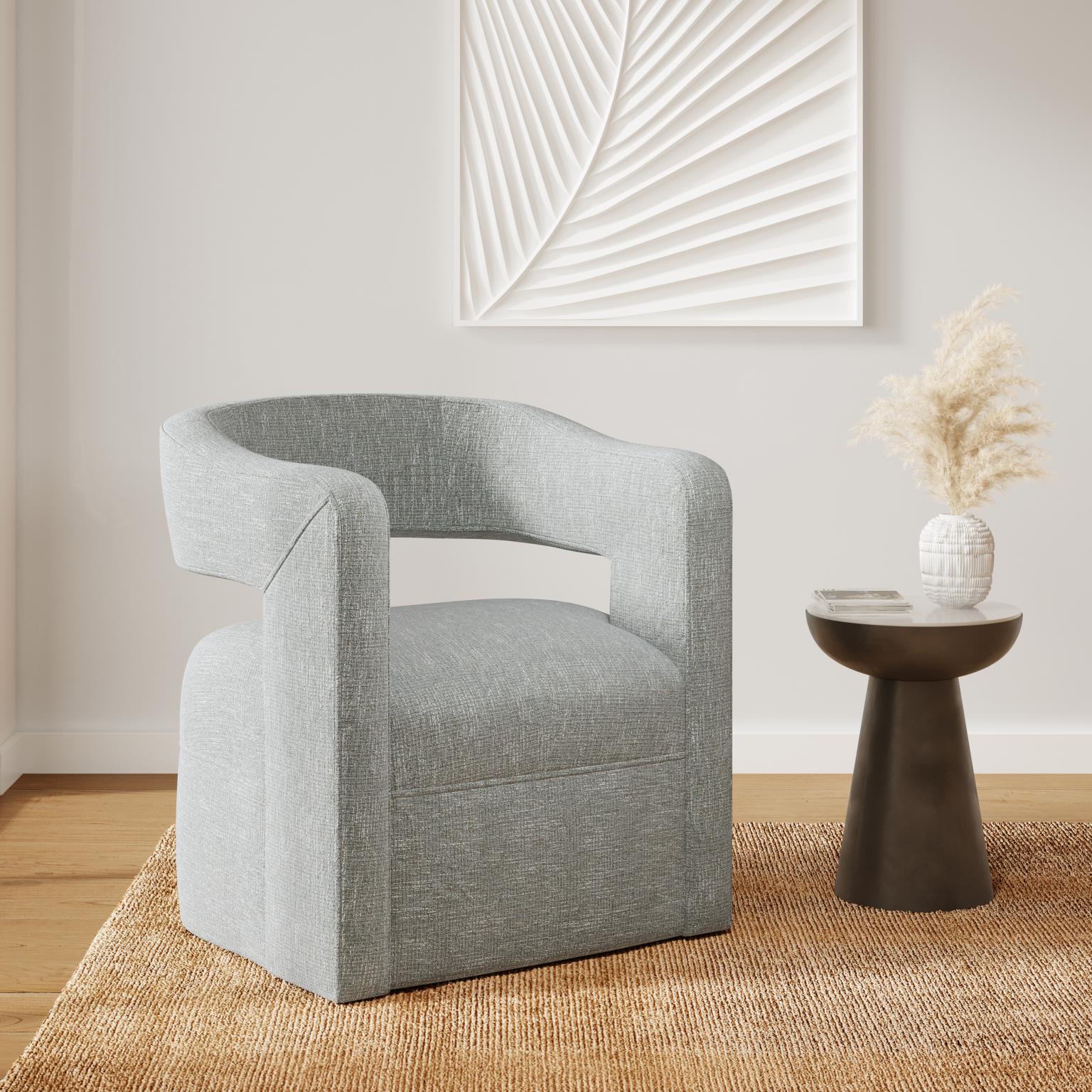 Leith to nowoczesny i stylowy fotel obrotowy, który łączy elegancką formę z wygodą użytkowania. Jasnoszara tapicerka z wysokiej jakości tkaniny oraz modne, zaokrąglone kształty sprawiają, że mebel doskonale wpisuje się w nowoczesne wnętrza. Idealny zarówno do salonu, jak i domowego biura.
